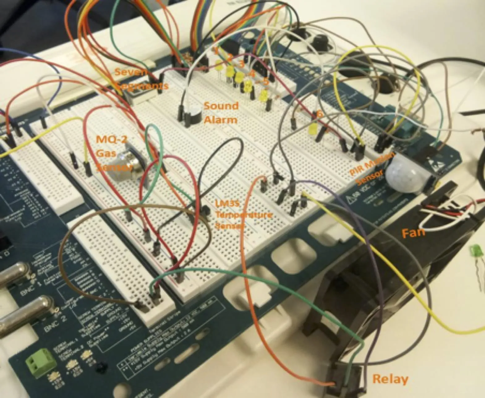 That is, with advanced graphical programming approach, the workflow is optimized with proprietary products from National Instrument such as NI ELVIS Board and NI DAQ for data acquisition, simulation and design implementation. Namely, PIR Motion sensor HC-SR501, Temperature sensor LM35 and Gas sensor MQ-2 were selected to achieve the desired tasks.