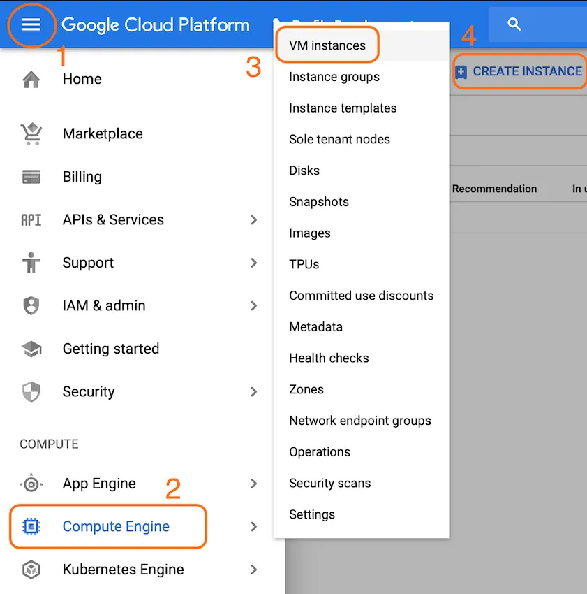 First, access the Cloud Console ↗ of your GCP Project and proceed to the Navigation menu (top-left corner) to tab Compute - Compute Engine. There will be a button to create the instance at the top bar.