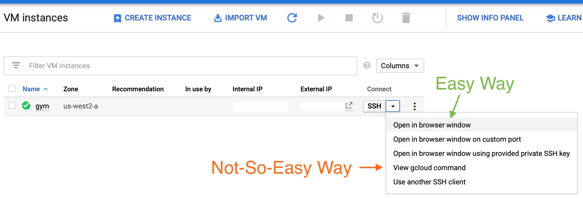 By now you have got the instance up and running, as in the same tab Compute Engine - VM instances. In column Connect, simply expand and chose the appropriate option to initiate a session with your instance.