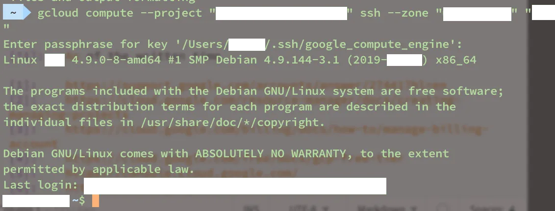 You are almost there !!! Run the previous “View gcloud command” to establish SSH connection to the VM instance and you are all set. FYI, the command has the format of