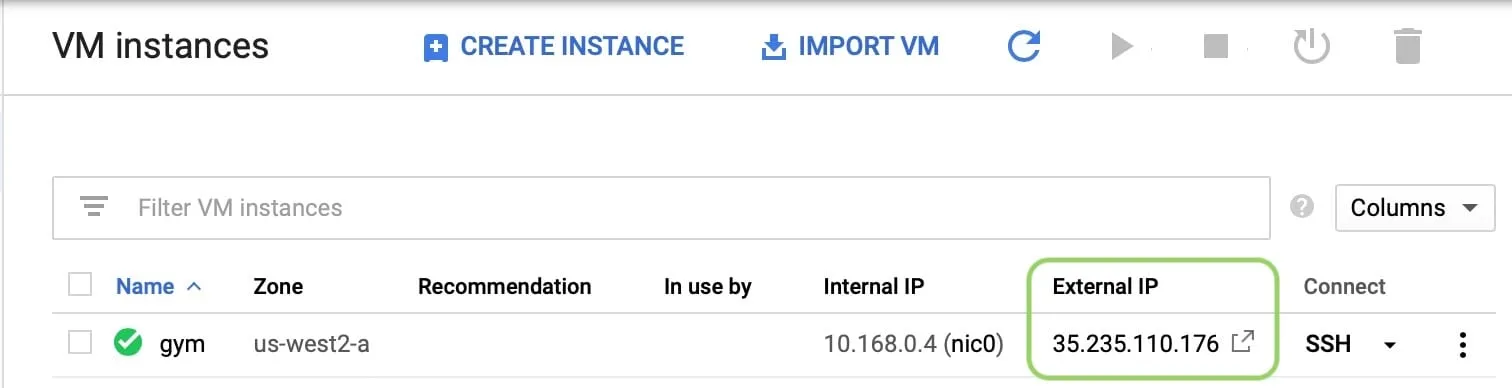 The only step left is to find your VM External (Global) IP Address and access into it from your local computer.