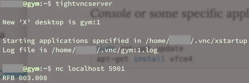 Success initialization of the VNC Server. Port 5901 returns value meaning it is listening and RFB indicates our server is up and running